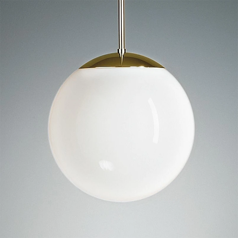 This pendant light was designed in Germany around 1900. At that time came up a concept which knows how to thrill today as more than 100 years ago. The light consists of a suspension made of either chrome-plated metal or brass, which extends to a small part of the opalescent glass ball. This combination makes it very elegant. The owner is also certain of integrating a period of German history according to original design in his/her premises.
