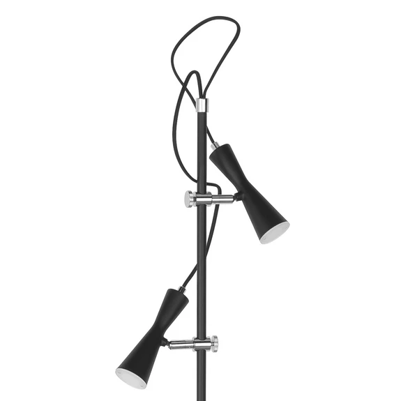 Wittily designed LED floor lamp Move with dimmer Move is an LED floor lamp that is guaranteed to attract attention and become an eye-catcher in the living room. The frame of the floor lamp consists of a round, stable lamp base and a round tube to which the two spots are attached. These two spots with flexible cables protruding from the standpipe can be attached to the frame at different heights using the silver brackets with fixing screw and can also be rotated around the tube. The slim spotlights with a white interior can also be rotated and swivelled. Warm white LEDs produce energy-saving and targeted lighting that can be dimmed as required using the integrated dimmer. The Move LED floor lamp is also sure to attract enthusiastic glances in teenagers' rooms or young people's living areas.
