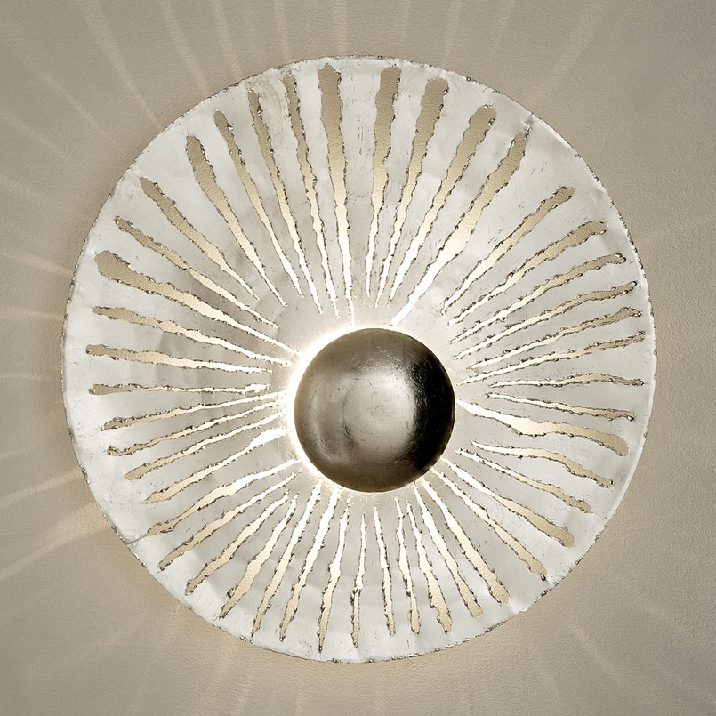 The Pietro LED wall light has a body made of iron, which is plated in silver leaf, and has an attractive radial pattern that looks like a sun. Six LED bulbs provide a bright light. The Pietro wall light can also be installed as a ceiling light.