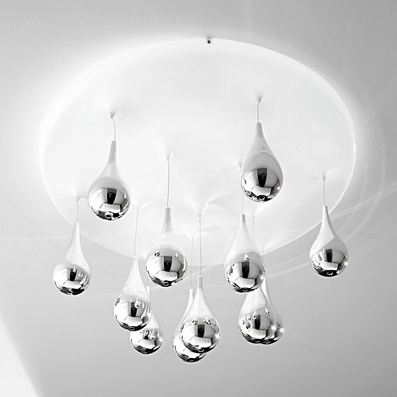 Designer ceiling light Pioggia is an artistic representation of nature. A sky, which can provide the room with indirect light is now possible. Diverse chrome-plated lampshades hang as if in motion like falling rain drops.