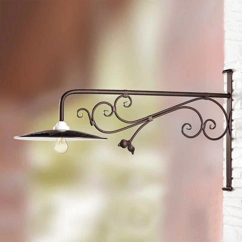 Elegant PORTO GRANDE wall lamp with enchanting wall holder This elegant PORTO GRANDE wall lamp is just right for the romantic country house. The ceramic shade with the black upper side is flat and expansive and optimally reflects the light that is emitted downwards by means of the white underside. The extremely decorative metal wall bracket is colour- and style-coordinated and a real eye-catcher.