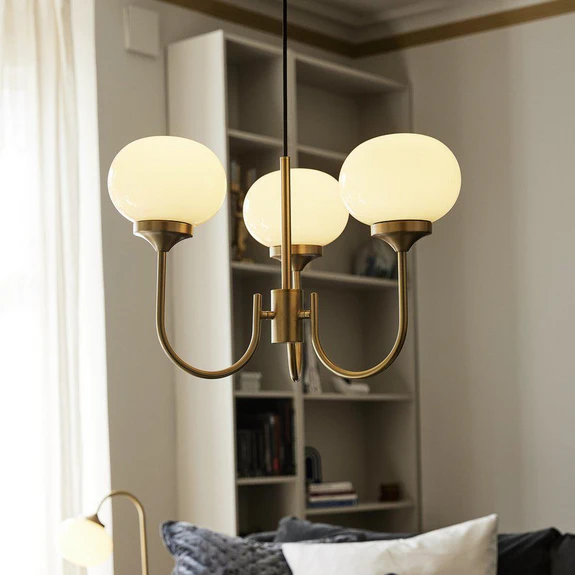 3-bulb Elsy chandelier in brass finish with oval glass lampshades The Elsy chandelier not only impresses in private living areas, but also in cafés and restaurants with its elegant character. The three oval, almost spherical lampshades are made of glass, the cream-coloured shade of which provides soft light on all sides. The structure with curved arms and the cone-shaped canopy are made of iron with a brass finish - The glass is finished by hand, so slight variations may occur.