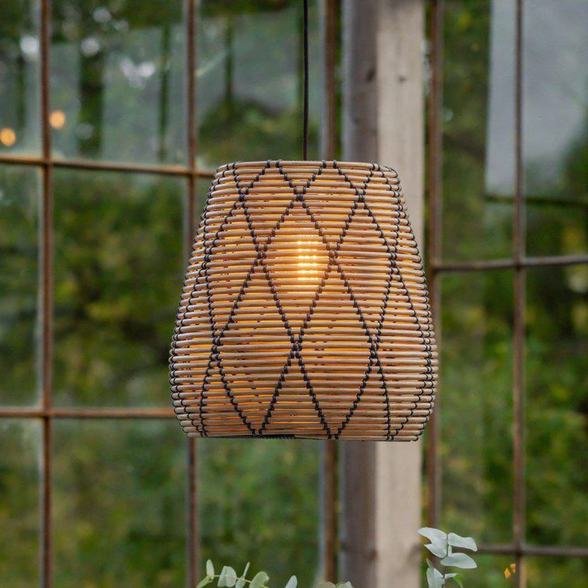 Lollo pendant light for patios and balconies in a natural colour Lollo is a small, beautifully designed polyrattan pendant light for outdoor use. The Lollo lampshade has a round, thicker polyrattan weave with black threads to emphasise the modern look. Polyrattan is a durable material for outdoor use. The woven structure creates a beautiful, atmospheric light