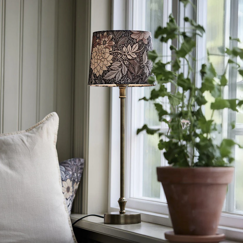PR Home table lamp Liam Sofia: elegance meets versatile colour design The PR Home table lamp Liam Sofia combines stylish elegance with a fascinating colour design. The Liam metal stand is combined with the Liam Sofia lampshade. The latter is made of recycled polyester textile with the colourful "Dahlia Brown" plant pattern. Together with the brass finish of the standing star, this table lamp blends seamlessly into various living areas such as the living room, dining room and bedroom. With its sophisticated design, the table lamp not only offers an aesthetic enhancement, but also a functional lighting solution. The harmonious combination of materials and colours makes it a versatile furnishing item that serves as both a decorative element and a practical light source. Discover the possibilities that this lamp offers to transform the ambience in different rooms.