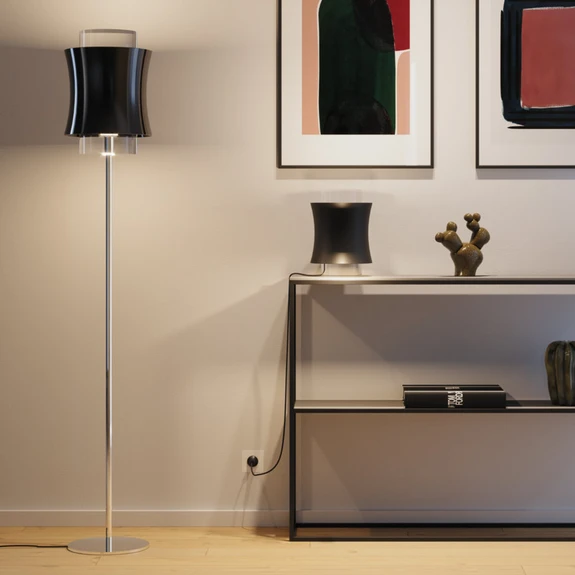 Fez F1 floor lamp in an exquisite combination of materials The elongated metal and Glas combination shines elegantly and with style on the lamp rod. Fez forms a relationship between two cylinders, one of which is transparent and straight as a cylinder made of crystal glass, while the other is solid, reflective and concave, formed from metal. Die light thus emits its light upwards and downwards. It is suitable for ambient lighting in meeting rooms, hotel lounges or in living and sleeping areas. Thanks to its subtle colour and clear design language, Fez is both simple and expressive and can be easily integrated into many styles. The Italian light manufacturer Prandina has made an international name for itself, particularly for its mouth-blown lights. Its design creations are used primarily in hotel chains, bars and restaurants, villas or even offices and galleries. Another of Prandina's trademarks is that each creation tells its own "light story" to be explored.