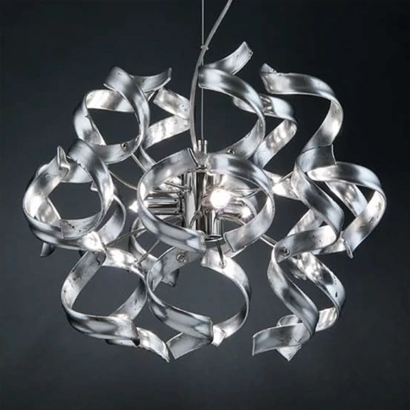The hanging light Silver captivates with its modern appearance. This is especially due to the glossy colours, as the surface has silver and chrome-plated elements. In combination with the spiral elements, in the centre of which are the bulbs, a very exceptional light is created.