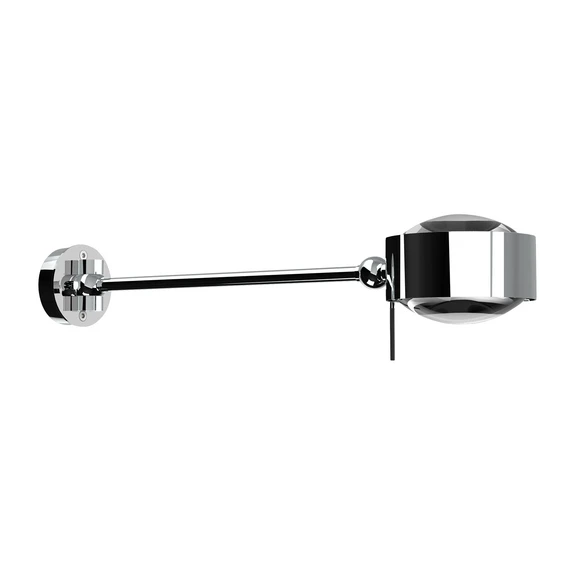 Puk Maxx Hotel LED wall light, swivelling and rotatable The PUK Maxx Hotel LED wall light impresses with its modern, simple design and high functionality. It provides an appealing Up and downlight that creates sharp-edged cones of light on the wall. This targeted lighting is made possible by the two clear Glas lenses, which are inserted into the metal housing at the top and bottom. The round head can be rotated and the graceful arm, which is attached to a discreet wall mount, can be swivelled, giving the wall lamp a high degree of flexibility. A small adjustment pin on the head makes it easy to adjust the alignment - Dimmable via trailing edge dimmer To give the lighting a colourful highlight, it is possible to place various colour filters under the lenses, which can be purchased as an option.