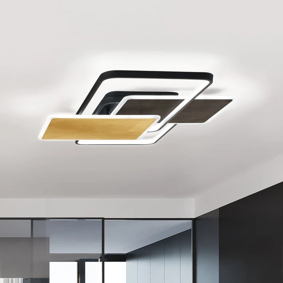 Quadro LED ceiling light: elegance meets CCT functionality Experience a new dimension in room lighting with the Quadro LED ceiling light. The interplay of black design and gold leaf accents lends any room a modern yet elegant touch. The integrated CCT function allows you to vary the light colour as desired - from warm tones for a cosy atmosphere to cooler nuances that promote concentration and productivity. The Quadro is not only a visual highlight in your living room, dining room, hallway or kitchen, but also a sign of energy-conscious lighting. With the permanently installed LED light source, you benefit from a long-lasting and energy-saving lighting solution. The ceiling light is also equipped with an included dimmer that allows you to adjust the brightness to suit your individual needs. Make a statement in terms of style and functionality with the Quadro LED ceiling light - Controlled using the included remote control - Dimmable, light colour infinitely adjustable from warm white to cool white