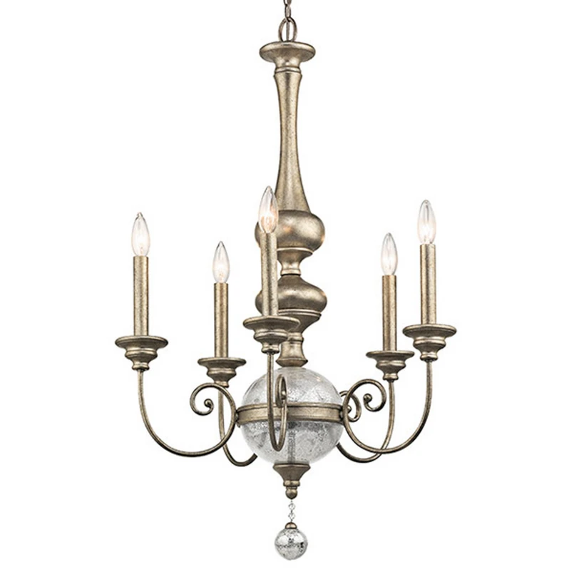5-bulb chandelier Rosalie in Williamsburg design The colour scheme of the Rosalie chandelier, which already catches the eye with its decorative Williamsburg design, is called Sterling Gold Finish, a mixture of gold and silver tones that looks particularly glamorous. Other eye-catching features are the glass element in the centre and the glass pendant hanging from the middle. Both glass elements are made of Mercury glass, which impresses with its fine structure. A great light source for luxurious glamour in the living room.