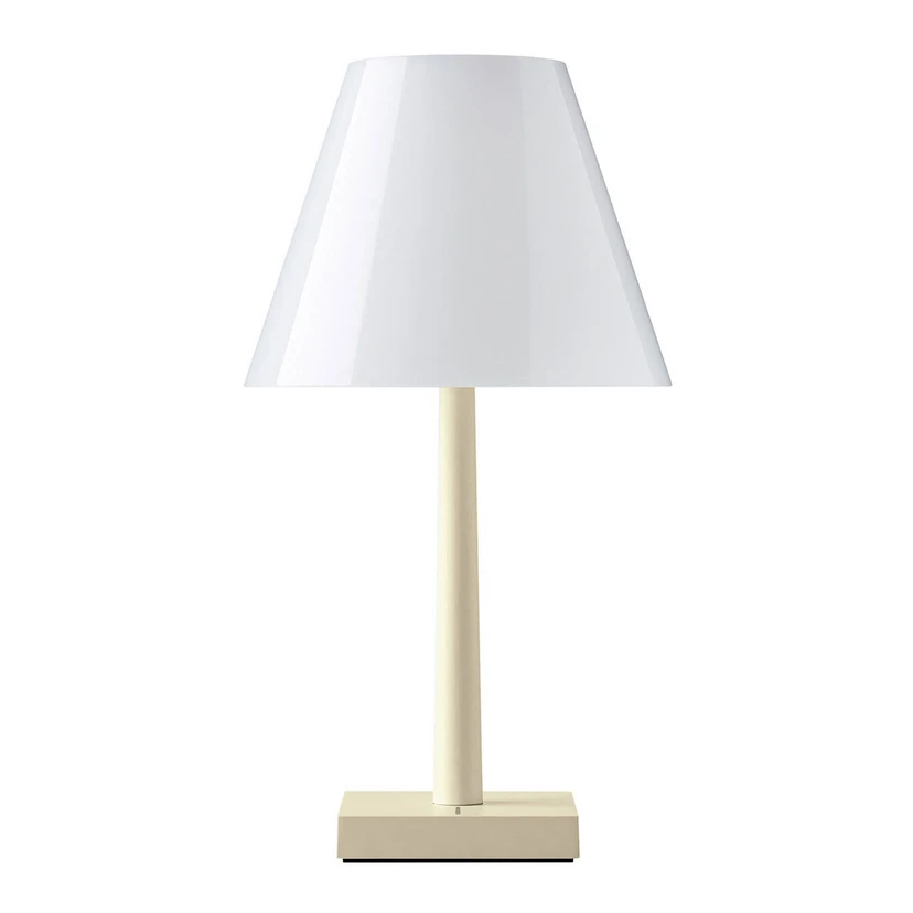 The LED table lamp Dina has an almost classic appearance due to its standardised shape with the white, slightly flared shade and the stable, square base. But if you take a closer look at the details, you will see that high-quality materials such as opal-coloured polycarbonate and matt aluminium have been used here.