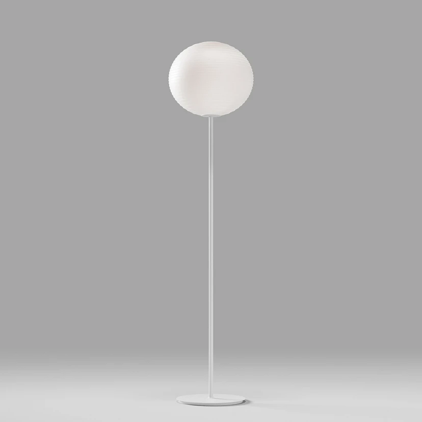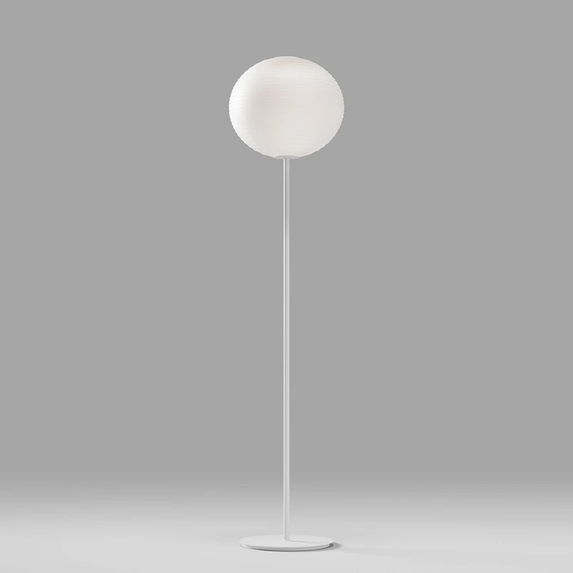 Flow Glass floor lamp with a lampshade A very simply designed steel lamp frame, painted matt white, supports the glass, timelessly elegant lampshade of the Flow Glass designer floor lamp. Thin, concentric rings stand out on the glass, forming the fine structure of the floor lamp and reminiscent of an oriental paper lantern. The matt glass shade is evenly illuminated by the emerging light, creating pleasant, glare-free lighting. The light can be conveniently controlled and dimmed on the spot using a foot switch. Italian designers Dante Donegani and Giovanni Lauda have given the Flow Glass floor lamp a minimalist and simple design. Simplicity is also the keyword with which Rotaliana, the northern Italian lighting manufacturer, strongly identifies. Instead of chasing fashion trends, this manufacturer prefers to focus on sustainability peppered with innovation and is convinced of the need to offer useful and practical solutions for the home.