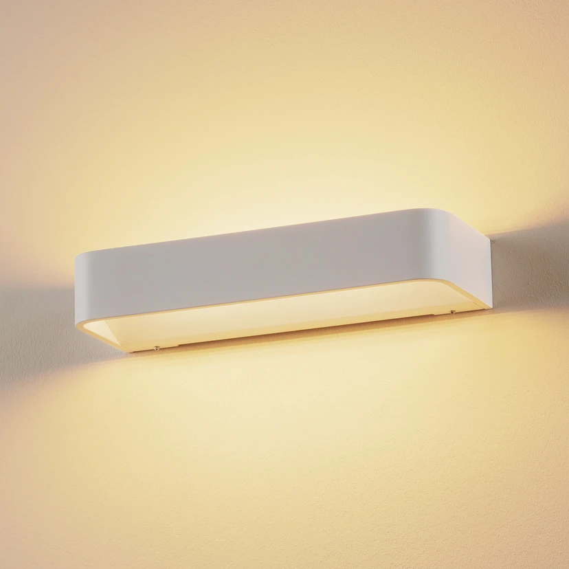 The extruded aluminium light consists of an outer frame and an inner pyramid-like element. The warm white light of the LEDs hits the wall above and below the light, providing pleasant general lighting.