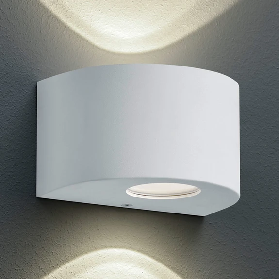 LED outdoor wall luminaire Rosario with uplight and downlightThe LED outdoor wall luminaire Rosario presents itself in a semicircular shape. The housing with matt plastic surface is provided with a round opening at the top and bottom, so that the light of the two LED light sources is emitted on both sides. For this purpose, matching covers are included in the scope of delivery, which provide interesting light patterns on the house wall with differently designed openings.