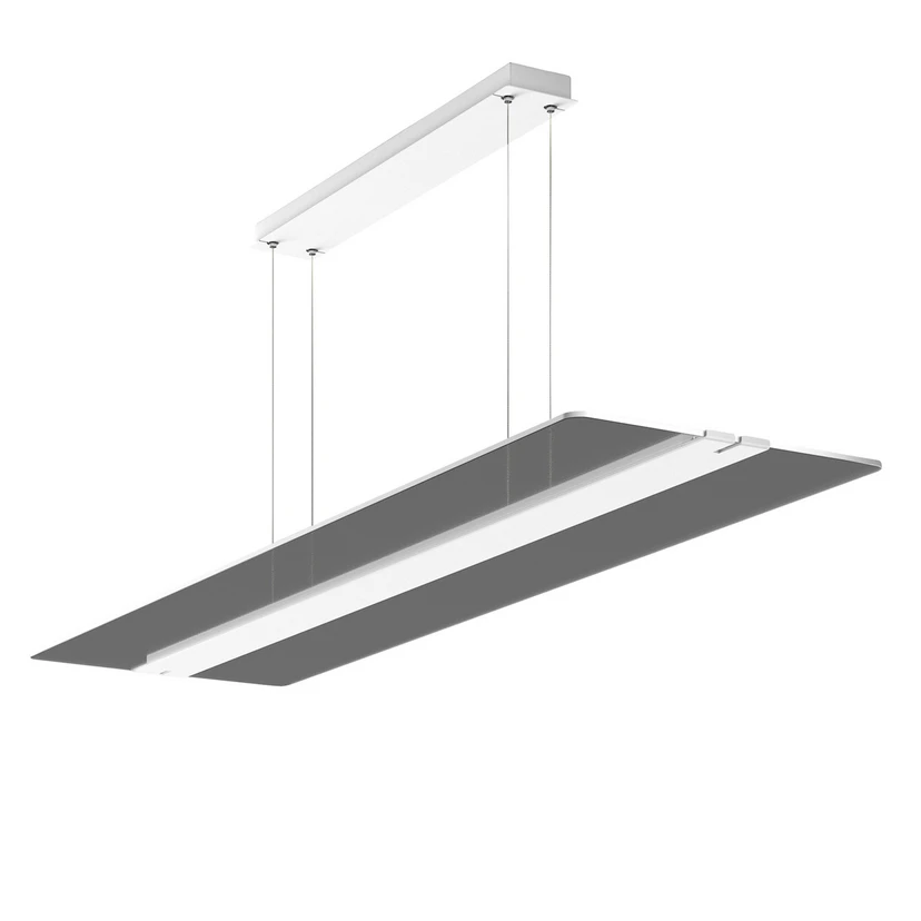 Flat LED office hanging light Twindot S with direct and indirect light, DALI-dimmable The LED office pendant light Twindot S provides homogeneous task and ambient lighting in modern offices. It impresses with its extremely flat design. The central bar made of white powder-coated extruded aluminium profile holds a light guide made of clear, UV-resistant acrylic on both sides. This is equipped with Twindot prismatic technology, which ensures a pleasantly soft lighting effect with soft shadows and minimised glare (suitable for VDU workstations in accordance with DIN EN 12464-1). The light is emitted 45 % indirectly and 55 % directly - Good glare control: UGR < 19 - Ballast (DALI) integrated in the rectangular canopy - Includes 4-point suspension system with stainless steel cables (pendant length can be adjusted from 50 to 120 cm before installation) - Ambient temperature during operation: - 20 °C to + 45 °C - Impact resistance: IK03