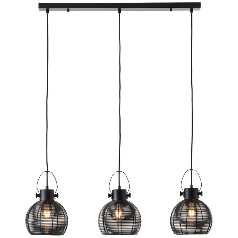 Sambo pendant light with decorative cage shades - 3-bulb This beautiful pendant light harmonises with a wide variety of furnishing styles, from modern to vintage to industrial, and provides fabulous illumination over a large area. Whether above a long dining table or over a counter in the kitchen, the aesthetically designed cage shades allow the light from the lamps used to radiate in all directions through the openings between the metal struts. The bulbs can be seen through the grid, which is why a particularly decorative overall look is created when filament bulbs with a carbon fibre look (available as accessories) are used - Can be shortened in height when mounted - Externally dimmable
