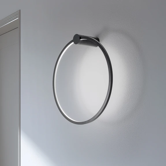 The Saturno LED wall light in a modern design consists of a narrow aluminium ring with cool white LEDs installed on the inside behind an opal cover, ensuring that the light is emitted evenly and without glare.