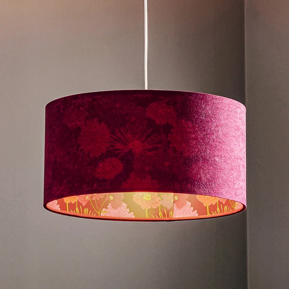 Floral Savanna hanging light with velvet lampshade The Savanna hanging light is stylish and discreet on the outside, while the retro charm of the light is only recognisable on closer inspection. After all, the lampshade made of elegant Samt has a floral print on the inside. The colourful pattern, which harmonises wonderfully with the colour of the textile shade, simply puts you in a good mood. The warm colour scheme in rich red tones also makes this hanging light look extremely glamorous. If you want to create a stylish eye-catcher above a dining or living room table, this powerful pendant light with the melodious name Savanna is the perfect choice.