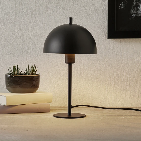 Elegant Kia table lamp with metal shade The discreet Kia table lamp is made of metal and impresses with its casual design. Its bulb sits under a semi-circular lampshade, which is placed on a Filigran frame. The light produced is dimmed by the lampshade so that it does not dazzle and creates a cosy atmosphere. As the lampshade is not translucent, the light shines directly downwards onto the surface. The Kia table lamp can be switched on and off as required using a cable switch. Thanks to its simple appearance, it can be integrated into any furnishing style and makes a good impression on the bedside table or chest of drawers.