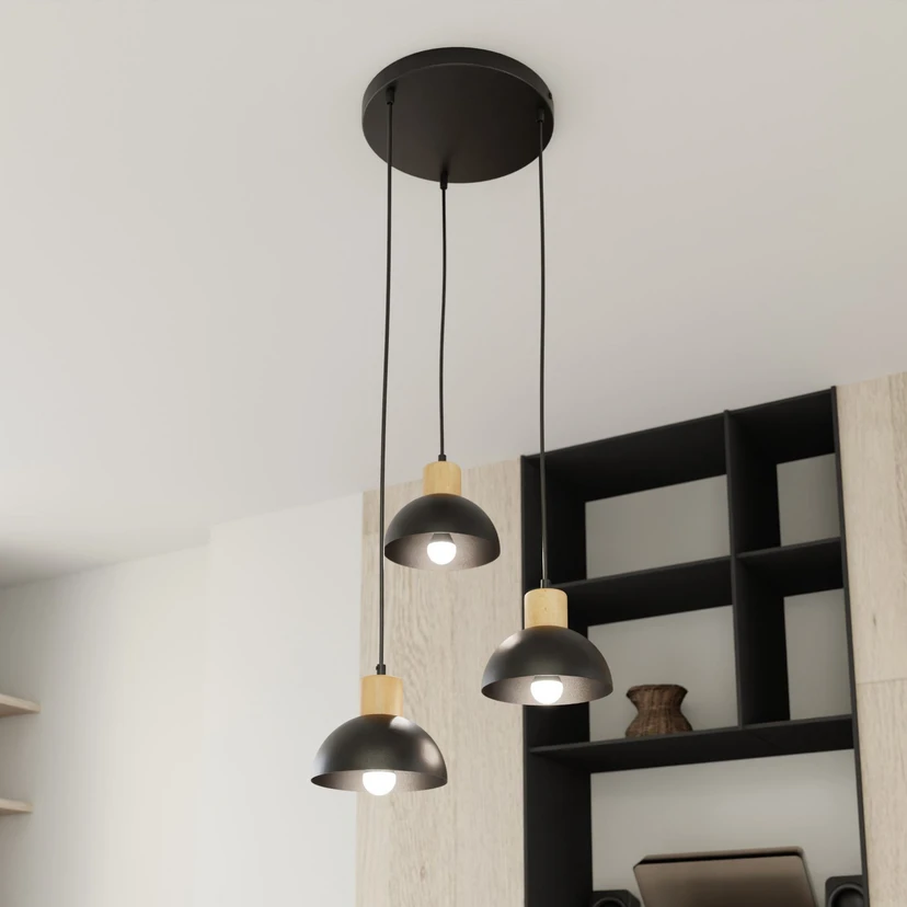3-bulb Seco pendant light - black with light-coloured wood details The Seco hanging light combines the robust elegance of steel with the warm radiance of light-coloured wood. This harmonious combination makes it an eye-catcher in any living room or dining room. With its timeless design and a diameter of 30 cm, it blends seamlessly into a wide variety of interior styles. Manufactured in Europe, the lamp stands for quality and durability, making it a valuable addition to any room - Externally dimmable