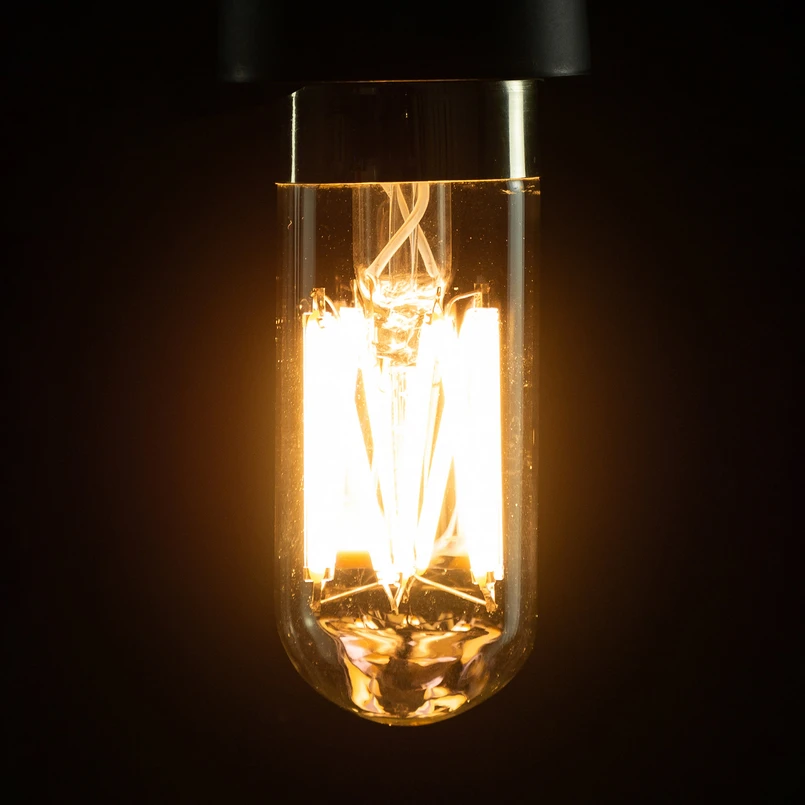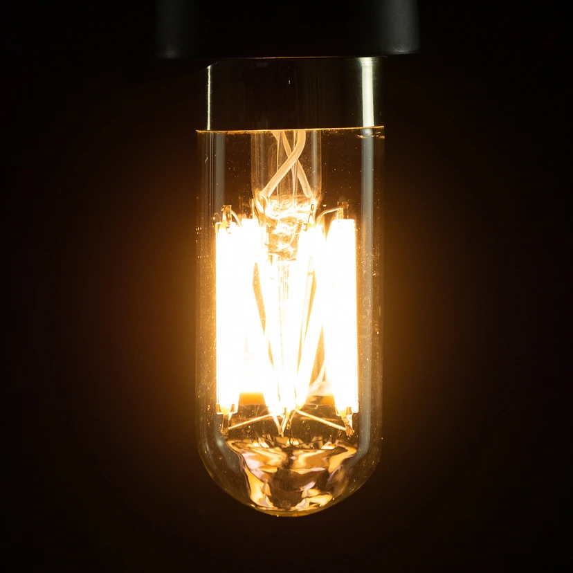 Dimmable E14 LED bulb Tube Filament with clear glass, warm white, 6.7 W The modern Tube LED bulb for E14 sockets is both visually and technically impressive. Its visible filaments ensure good lighting and also make it an eye-catcher, even when it is switched off. Thanks to its transparent glass, the light is emitted unhindered and it is also possible to dimm the brightness externally - Comparative value: 58 watts - Warm white light colour (2,700 K) - High colour rendering index (CRI >;90) - Number of switching cycles: 100,000 - Externally dimmable
