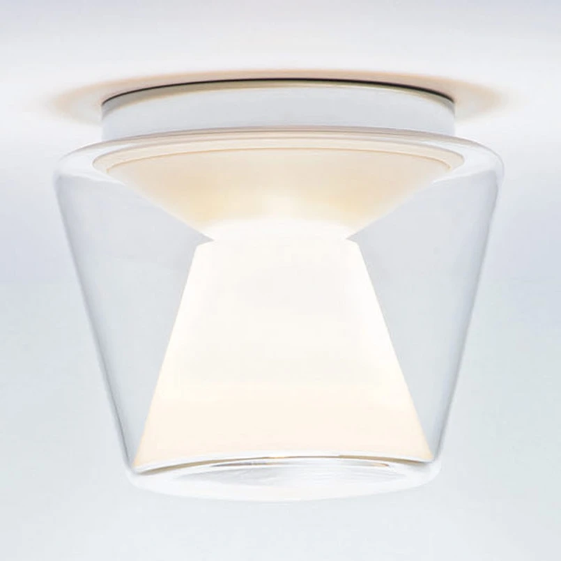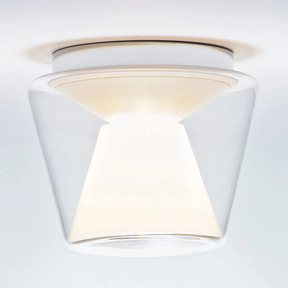 Mouth-blown glass shade: LED ceiling lamp Annex The designer lamp Annex by serien.lighting can boast both an elegant exterior and a sophisticated lighting effect. The conically shaped, mouth-blown glass body is very elegant with a little understatement. This clear, outer shade is complemented by an inner, also conical shade made of opal acrylic. The opal shade is essentially responsible for directing the light: on the one hand, Annex emits light downwards, but the opal shade also diffuses part of the light sideways, so that a gentle room illumination is given. Annex is a ceiling lamp that can be used in both private and commercial areas. Whether hotel corridor or domestic living room - all these areas are illuminated with style and finesse by Annex. The LEDs can be dimmed via a phase-cut dimmer.