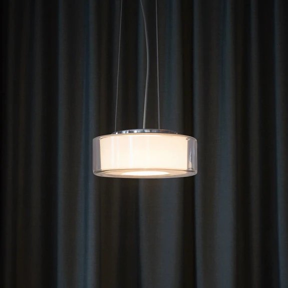 Made of glass, stainless steel and aluminum LED pendant lamp Curling with reflector in cylindrical shape, 2,700 KName and design reveal at first glance that the designers and founders and CEOs of serien.lighting, Jean-Marc da Costa and Manfred Wolf, were inspired by the winter sport of the same name for the lamp series Curling.Inside the shade, which is made of mouth-blown glass in Germany, there is a cylindrical reflector made of opal polycarbonate in this version. This allows laterally as well as upward the warm white light only gently shine through. Also below the integrated LEDs, which emit warm white light with excellent color rendering, is another diffuser, which ensures a homogeneous illumination of the area below.For a customizable brightness, the pendant lamp is externally dimmable via Triac. The LEDs are located inside a luminaire unit made of polished aluminum, which in turn is installed on the ceiling via three stainless steel cables on the canopy, also made of polished aluminum.