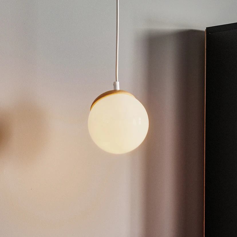 The Sfera 1-bulb pendant light combines modern design with natural materials to create a fascinating play of light in any room. Made of glass, wood and steel, this light offers a harmonious combination of opal, light wood and white tones. The option of dimmability via an external dimmer allows flexible adjustment of the light intensity to create the desired atmosphere.