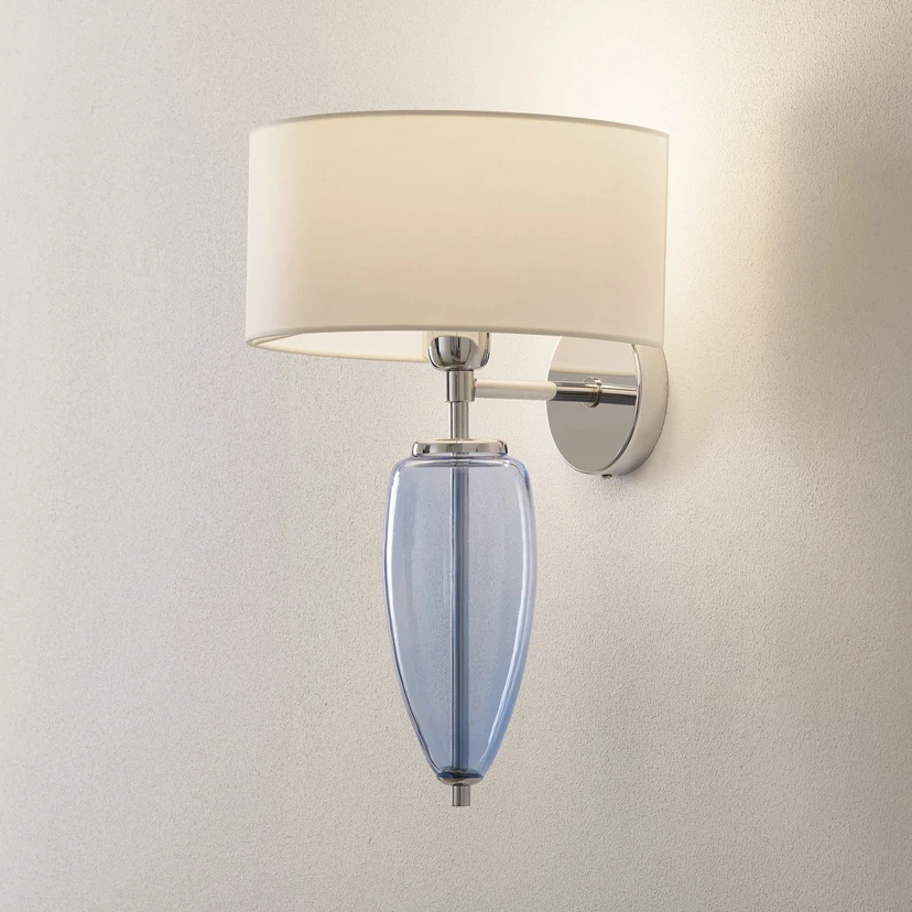 Show Ogiva wall light with fabric shade and glass decoration The beautifully shaped, hand-blown glass element, which adorns the lower part of the wall mount and is particularly emphasised by the light it emits, gives the Show Ogiva textile wall light an eye-catching touch. But Show Ogiva is not only an ornament for any living room or bedroom when illuminated. The glass has been mouth-blown in the Italian artisan tradition and its aesthetics draw attention to itself even when the light is not switched on. Show Ogiva - a wall light that provides soft accent lighting and also acts as a decorative element in the room.