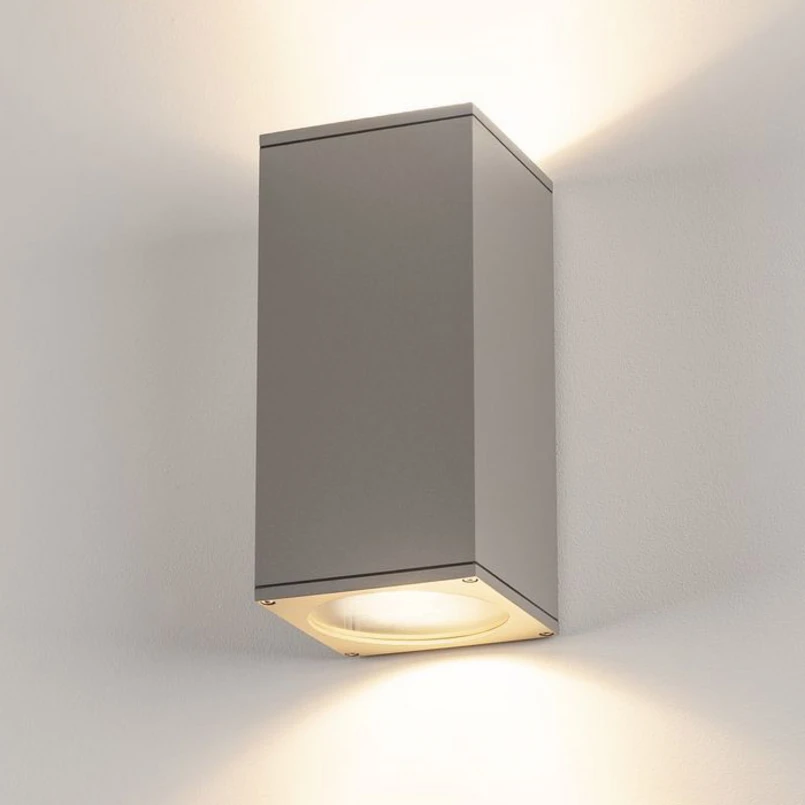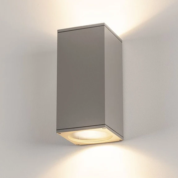 Discreetly designed outdoor wall lamp Big Theo with double-sided light emission The outdoor wall lamp Big Theo is a lighting object that not only guarantees ideal illumination of paths around the house or garage, but also skilfully sets the scene for the façade. With its two light openings, it provides both indirect and direct lighting, creating a special lighting atmosphere. The angular aluminium housing is coated with a final coat of coloured paint and protected from the weather by two glass covers (IP44).