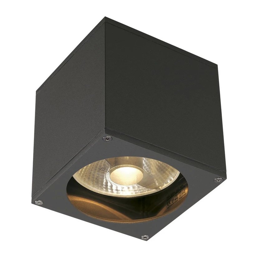 Modern outdoor wall light Big Theo in cube design Big Theo is an outdoor wall light that fits perfectly into modern outdoor areas. It is designed in a cube shape and coated with a final coloured lacquer. The robust aluminium body has a round recess at the bottom, into which the GU10 bulb (see accessories) is inserted. The light shines directly downwards, skilfully highlighting pathways or the house façade itself. An additional Glasabdeckung protects the bulb from the weather.