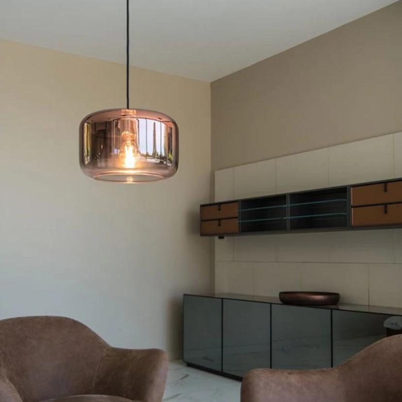 Elegant Pantilo pendant light made of Glas with colour fade The elegant, timelessly beautiful Pantilo pendant light has a wide, rounded cylindrical shape. It is fitted with a dark textile cable that leads into the glass shade via a metallic element. The glossy lampshade is tinted at the top and merges into a clear area at the bottom. This flowing gradient gives Pantilo its characteristic appearance, which is also reflected in the light distribution. While soft ambient lighting is created in the upper area, the light is emitted unhindered at the bottom. Whether used in groups or individually, the pendant light is ideal for illuminating tables, counters and Theke. Due to the transparent glass shade, a filament bulb should be selected to emphasise the decorative aspect - Supplied with open cable end without canopy - Can be combined with Fitu Mix & Match accessories