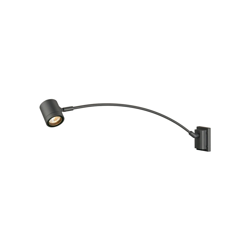 Myra Display wall light - can be used outdoors thanks to IP code IP55 The curved display light from the Myra series is made of painted aluminium and glass, which covers the bulb. The head of the luminaire is mounted on a curved bracket and can be swivelled and tilted. Myra Display can be combined with many wall designs in terms of colour - Can be rotated horizontally through 340° - Can be swivelled vertically through 45
