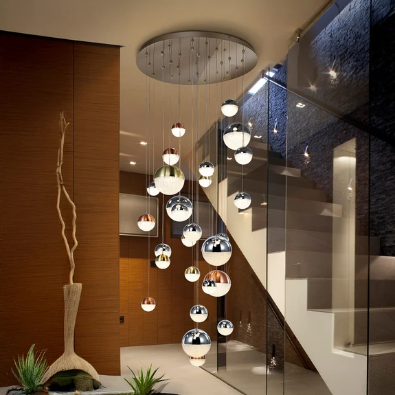 The Sphere LED pendant light is impressive with its imposing maximum suspension system and 27 spherical lampshades of different sizes, made of metal at the top and polycarbonate at the bottom. The upper halves of the lampshades are finished in copper, chrome and brass, which gives the light an additional interesting effect. The built-in LEDs provide energy-saving light and a pleasant, warm white light colour that creates a cosy atmosphere.