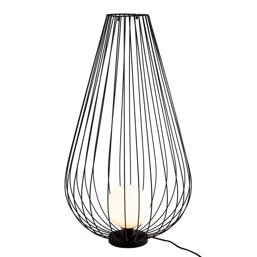 The Vega floor lamp illuminates both indoor and outdoor areas The Vega floor lamp can be used to set the scene not only in the Innes areas of your own four walls, because thanks to IP44, the light can also be placed on terraces, for example. The bulbous body of the light consists of a black metal grid that tapers towards the top. The bulb is inserted into an E27 socket at the bottom of the body, which is surrounded by a white plastic sphere to protect it from the elements.