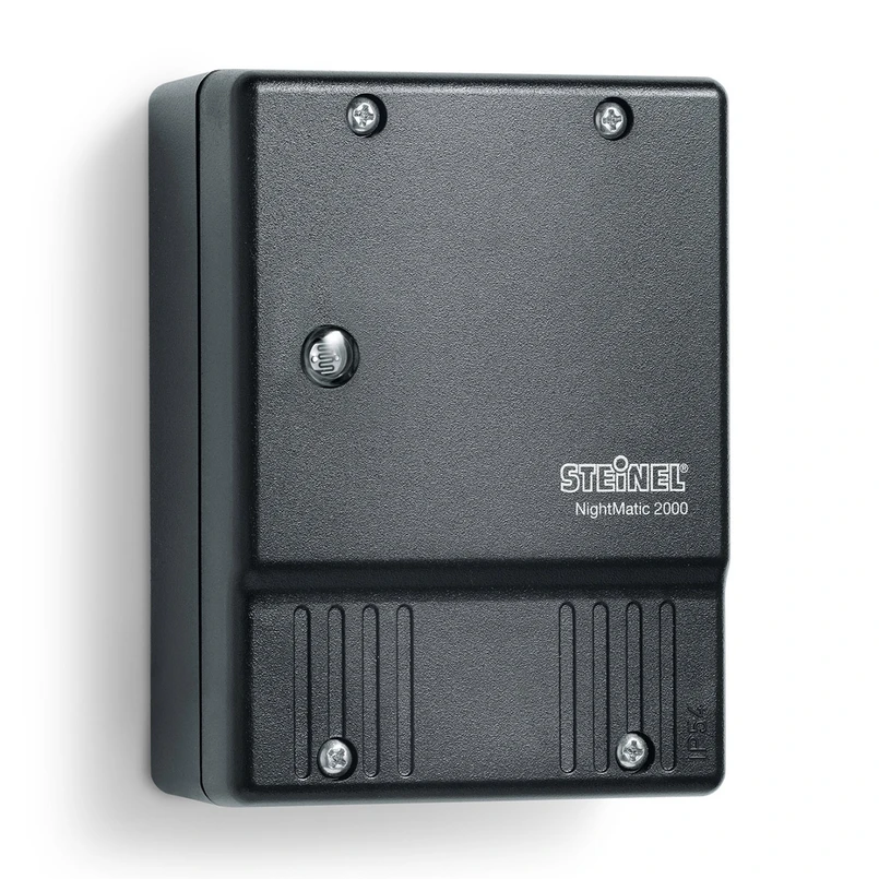Steinel twilight switch Ideal for controlling lighting systems that illuminate house fronts, properties, shop windows or other areas at night. Functional description The NightMatic 2000 registers the ambient brightness and automatically switches connected lights on in the evening when the twilight threshold is reached and switches them off again at dawn.