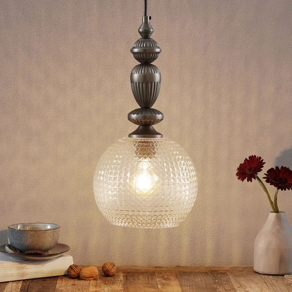 Talisa pendant lamp - shapely lamp with semicircular shade of cut glass This model captivates with the playful shape of the decorative surround and an intricately cut glass shade. The gentle curve of the shade is repeated in the fanciful ornamentation of the suspension. The countless facets of the lampshade refract and multiply the light, making the Talisa pendant lamp an impressively bright source of light. This shapely pendant lamp is a tasteful addition to nostalgic room solutions and furnishing concepts in the popular vintage style. The Talisa pendant lamp is best combined with glass or metal luminaires in a similar, decorative look to create a coherent lighting concept. Whether in a living room, as an attractive dining room light or to illuminate a hallway - the Talisa pendant lamp becomes an interesting lighting accent in just about any room.