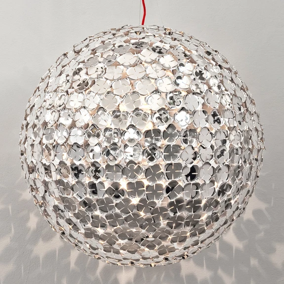 Orten'zia - pendant light with magnificent metal flowers Hydrangeas are known in our gardens for their long-lasting flowering splendour in the summer months - the pendant light of the same name even manages to provide an ornamental splendour all year round. Its lampshade is spherical and covered with countless small metal Blüte. This makes it reminiscent of the equally spherical hydrangea umbels, which in turn consist of many small Blüte. Small gaps have been left between the individual nickel-plated blossoms of the Orten'zia lampshade, allowing the light to escape and spread throughout the room. Due to this structure in the lampshade, a decorative shadow pattern is created on the wall and Deck. The Terzani lamp manufacturer was founded in Florenz in 1972. The Italian glass designer Sergio Terzani still brings his passion for Glas to the company's designs and products today. Terzani lights are a symbiosis of excellent craftsmanship, Tradition and Mod.