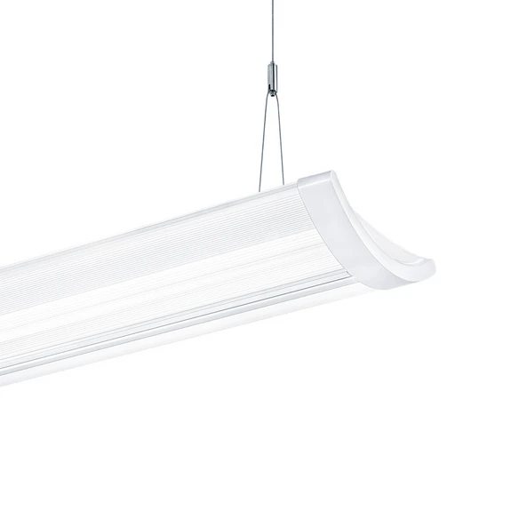 Functional IQ Wave LED ceiling light for office lighting This ceiling light is a pleasant and effective choice as the main light source in office and training rooms with reduced glare and shading, so that the eyes are spared and the ability to concentrate is maintained. The light from the LEDs is initially emitted upwards, reflected downwards in the light and emitted into the room through the matt polycarbonate diffuser. The main portion falls on the work area, while a smaller portion serves as ambient lighting above the wall and ceiling - Supplied with cable (2.5 m) and suspension cables, without canopy - Dimmable: Dali DA2, up to a minimum of 3% - Light emission: 78% downwards, 22% upwards - Chromaticity tolerance (initial MacAdam): 3 - Glare control: UGR <19 and L65 <3000 cd/m² - Weight: 4.4 kg - IP code: IP20 - Impact resistance: IK05