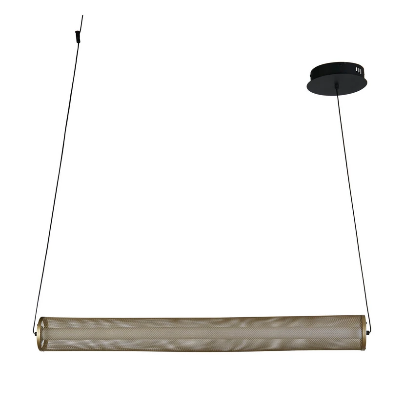 Thread LED pendant light, 3-step dimmable via light switch The Thread LED pendant light combines a modern design with a touch of industrial chic with the unique versatile feature that it can be installed both horizontally and vertically. Featuring a matt black metal ceiling plate and a stunning gold mesh shade that encases the satinised tube bulb inside, it becomes a standout feature and impactful light source in any room. The light can be switched to three brightness levels by pressing the light switch several times.