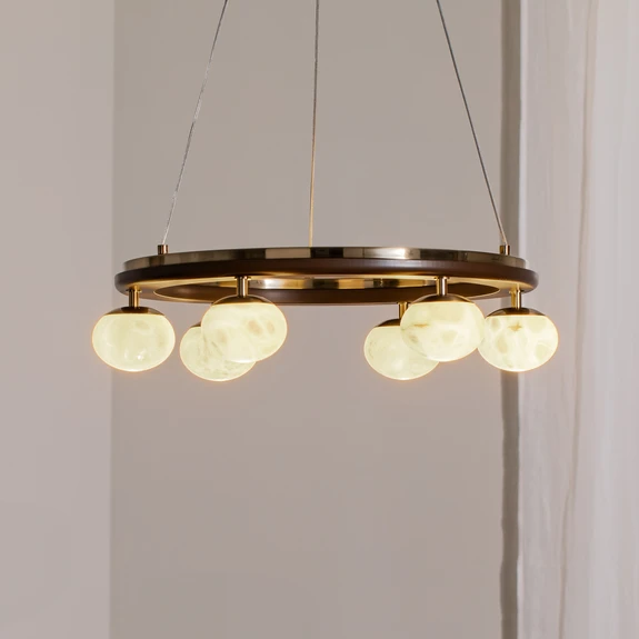 Tolosa pendant light, Ø 52 cm, brass, 6-bulb, glass, wood