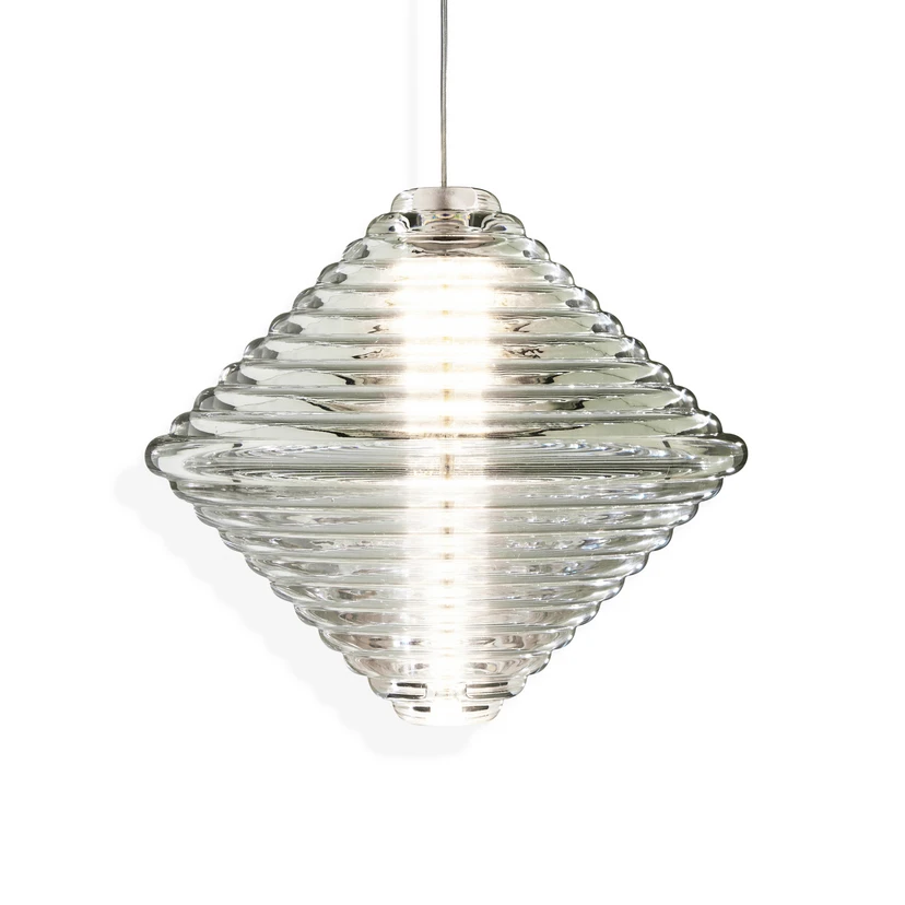 The glass shade of the Press Cone LED hanging light, which resembles a ship's buoy or a children's toy spinning top, is made from a glass ball that is melted at 1,200 degrees Celsius and pressed into iron moulds under pressure equivalent to several tonnes. The result is a beautiful, durable light whose grooved shape creates linear, striped patterns through the diffusion of light into the surrounding area.