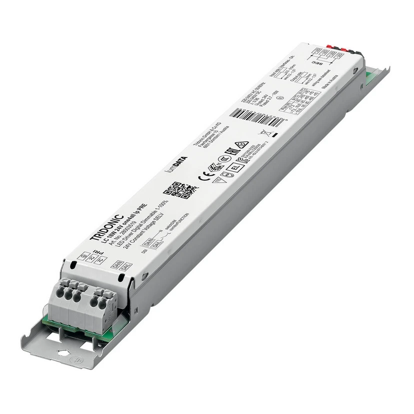 Constant voltage LED driver LC 24V one4all lp PRE IP20 from TRIDONIC for variable control - slim, flat, low-profile design This particularly slim and flat driver for supplying 24V LEDs is designed for luminaire installation. It is particularly suitable for solutions for cove lighting, façade accent lighting and indirect ceiling lighting and, thanks to the one4all interface, enables various control options for switching, configuring and dimming the lighting.