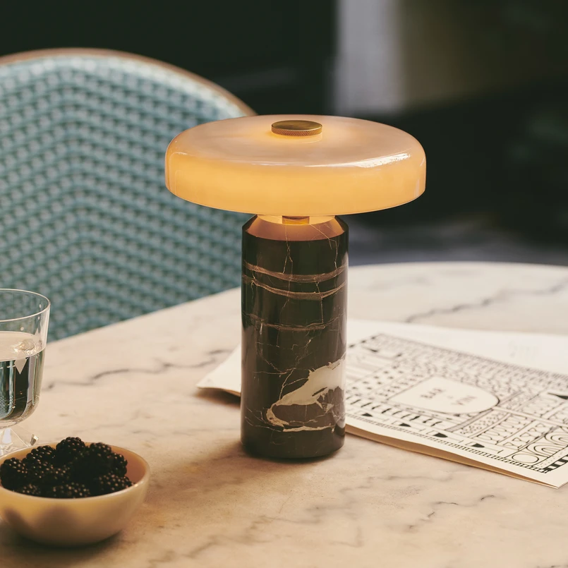 With 3-step dimmer & Charging station: Trip LED rechargeable table lamp made of marble and hand-blown glass, warm white, USB, IP44 Clear lines and a relatively simple design paired with high-quality, aesthetic materials - this is what characterises the Trip LED table lamp with rechargeable battery. The manufacturer DESIGN BY US has thought of every detail in this version of a portable, rechargeable LED table lamp. An integrated LED module produces warm white light that can be dimmed in three stages using a switch on the lampshade. In addition to a charging station, which is also made of marble, the scope of delivery also includes the matching USB cable (without mains adapter) for recharging. As Trip is equipped with a rechargeable battery and can therefore be operated wirelessly, there are countless possible uses with no ifs and buts - or as the saying goes: "No strings attached." The sculptural design of the polished marble body combined with the beautiful lampshade made of mouth-blown glass gives Trip a particularly exclusive look. With an IP code of IP44, it is suitable for both indoor and protected outdoor areas. Trip is ideal for use in the centre of the dining table to create an intimate atmosphere, on the bookshelf, on the windowsill or even on the bedside table. At the same time, it can also provide soft light in the garden in the evening and is welcome on any balcony. Technical features: - high-quality materials: marble base and blown glass lampshade - incl. marble charging base and 1.5 litres of water. Marble charging station and 1.5 m USB cable (USB-A to USB-C, without mains adapter) - warm white light colour - integrated 3-step dimmer - battery capacity: 7,500 mAh (up to 105 hours of lighting time) - charging time from 0 to 100 %: approx. 9 hours - IP code IP44 - protected against splashing water Note: Each marble light is unique. Differences in colour and structure are natural characteristics of the marble, the product photo may therefore differ.