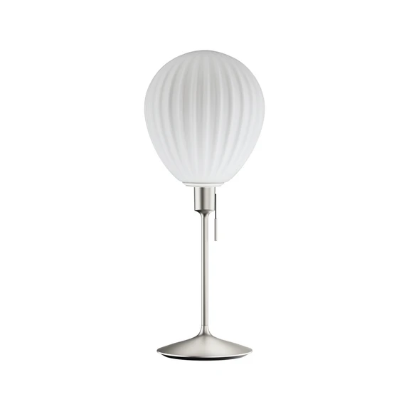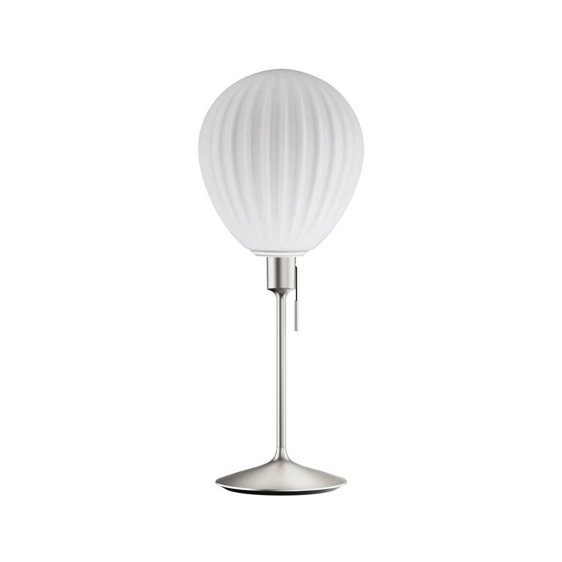 Table lamp Around The World with blown glass shadeThe shade of the table lamp Around The World is made of blown glass and has the shape of a hot air balloon - inspired by the universe of the famous author Jules Verne. Its milky white color, shape and surface texture, in combination with the simple and elegant steel frame, make it a perfect and harmonious addition to any interior. Through the shade, the light radiates glare-free and evenly, and even when switched on, the shade reveals all its beauty, because then the structure of the glass comes into its own even more effectively. The operation of the lamp is convenient via the pull switch on top of the frame.The table lamp Around The World is a product of the renowned Danish manufacturer UMAGE, the design of the mouth-blown shade comes from Luigi Vittorio Cittadini. Due to the production of the shade by hand, slight deviations from shade to shade may occur, which is not a quality defect, but testimony to the uniqueness of each copy.