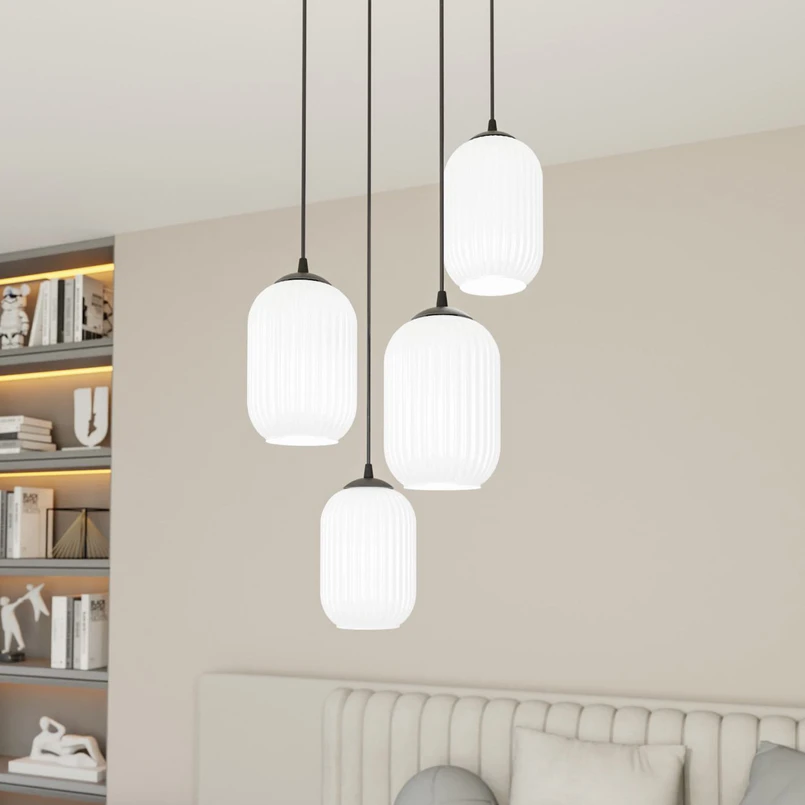Verdi hanging light with four opal glass shades The Verdi hanging light combines timeless elegance with modern versatility and is a highlight for any living room or dining room. Made of high-quality glass and robust, powder-coated steel, it impresses with its sophisticated design in opal and black. The 4-bulb construction ensures an even and pleasant light distribution that bathes any room in a harmonious ambience. Thanks to its sophisticated combination of materials and colours, the Verdi hanging light blends seamlessly into different interior styles. The use of glass gives the lamp a special lightness. This lamp is not only a functional lighting element, but also a stylish accessory that can significantly influence the atmosphere of a room - Externally dimmable