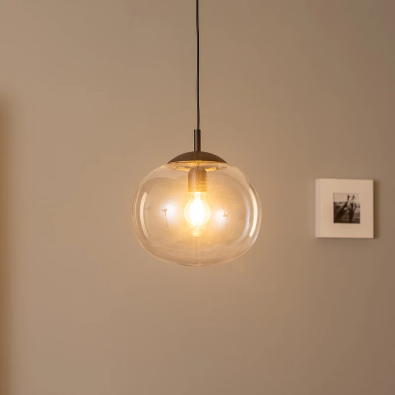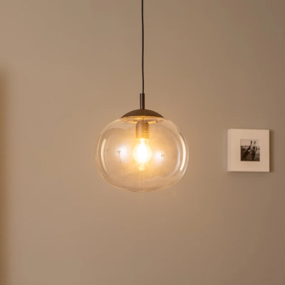 Vibe glass pendant light with round lampshade in a clear finish The Vibe pendant light is particularly impressive in modern furnishing concepts. It combines black elements with an almost spherical glass shade. The clear material allows a view of the inside, so that a decorative E27 bulb is perfectly accentuated.