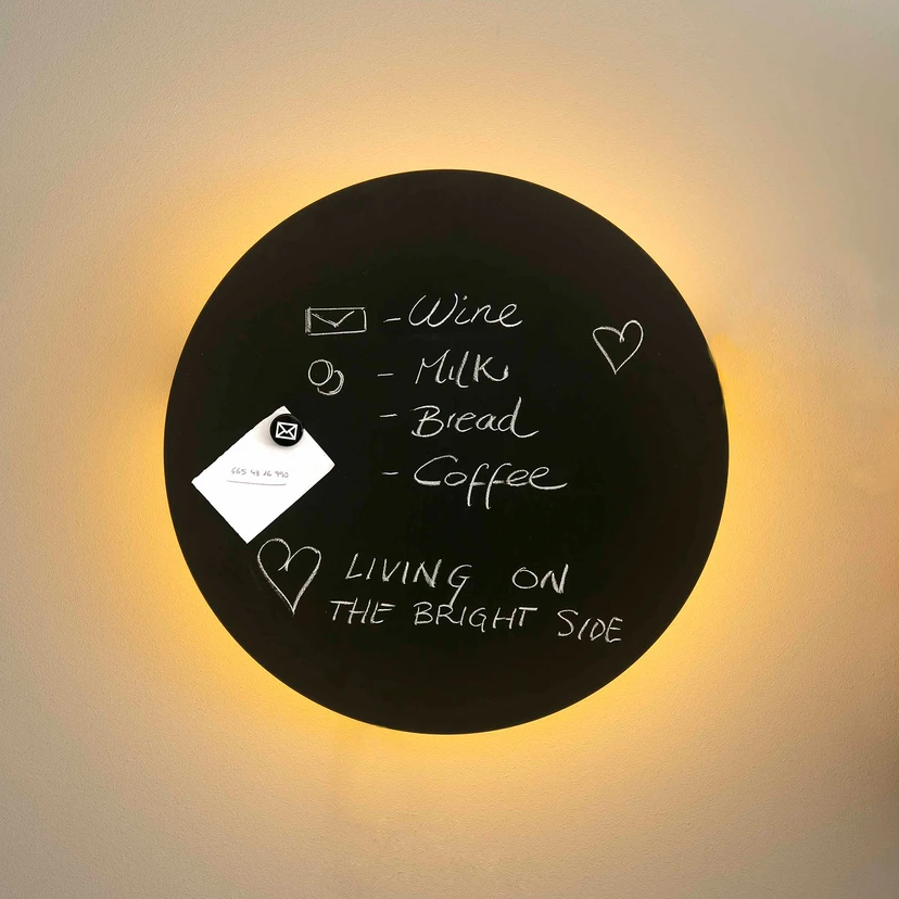 Writable and magnetic wall board with decorative light - LED bulb Board It is more than just a light object: the practical wall light Board consists of a writable and magnetic slate board that can be used as a large notice board, for example for shopping lists. Its LEDs mounted in the background shine indirectly and provide a warm, decorative light. Perfect for kitchens, dining rooms or corridors.