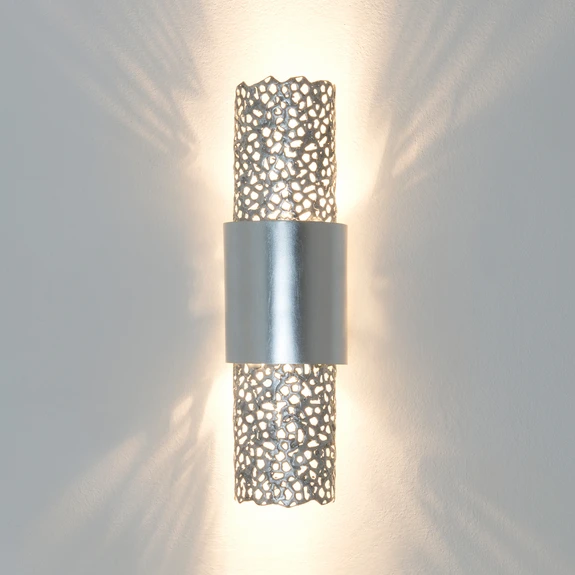 The wall lamp Palazzo is made of iron and attractively designed. The silver mesh at both ends creates charming lighting effects with its beautiful structure. The incorporated pattern gives the lamp an individual touch and provides a unique lighting effect, which in addition to the direct light emission upwards and downwards thus radiates in all directions. Even turned off, this high-quality wall lamp attracts all eyes. It can be mounted both vertically and horizontally.