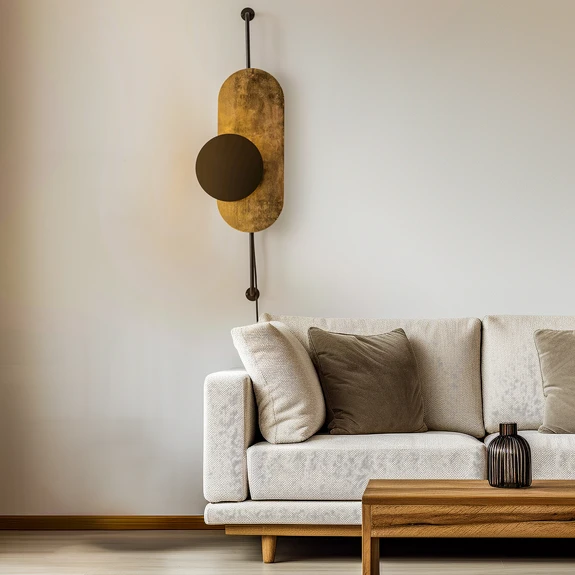 The Wheel wall light combines modern design with high-quality materials such as plywood and steel. The combination of a golden surface and black shade gives any room a stylish touch. This light is ideal for the living room or dining room and offers a fascinating lighting effect that can be both calming and stimulating.