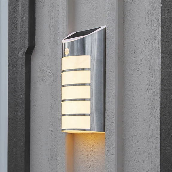 Wally LED solar wall light, ideal for entrance areas Thanks to the integrated solar module, the Wally LED solar wall light can be flexibly positioned on the exterior wall of a building and used as a light source in the entrance area. Wally impresses with its elegant look and interesting louvres from which the warm white light of the LEDs shines. The wall lamp has a built-in motion and twilight sensor. This means it switches on automatically in the dark when it detects movement - Detection range: 3-5 metres, 120° - Light duration approx. 5 hours - Light intensity 50 lumens when movement is detected, 8 lumens in constant mode